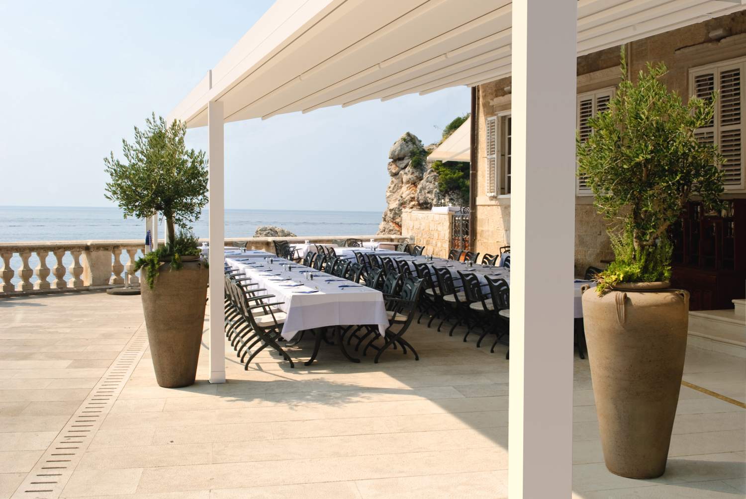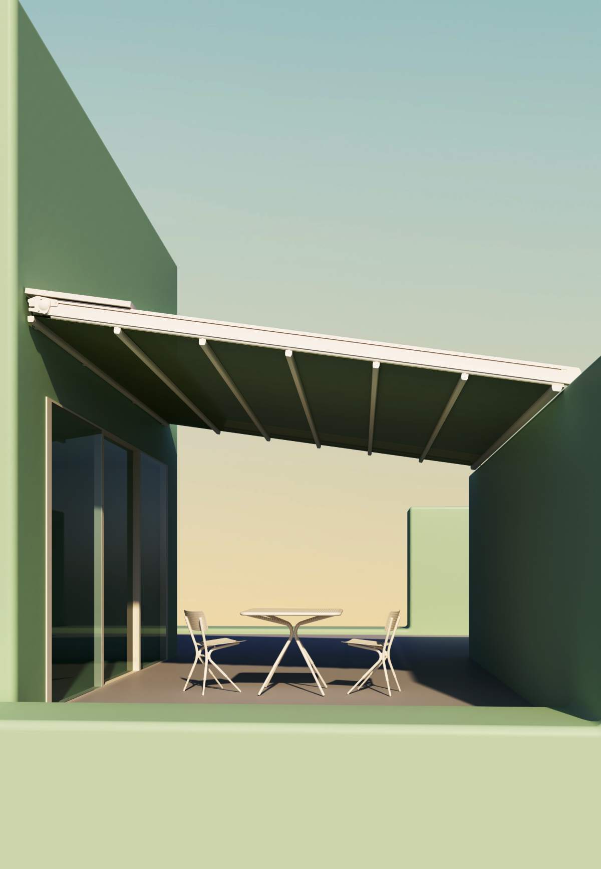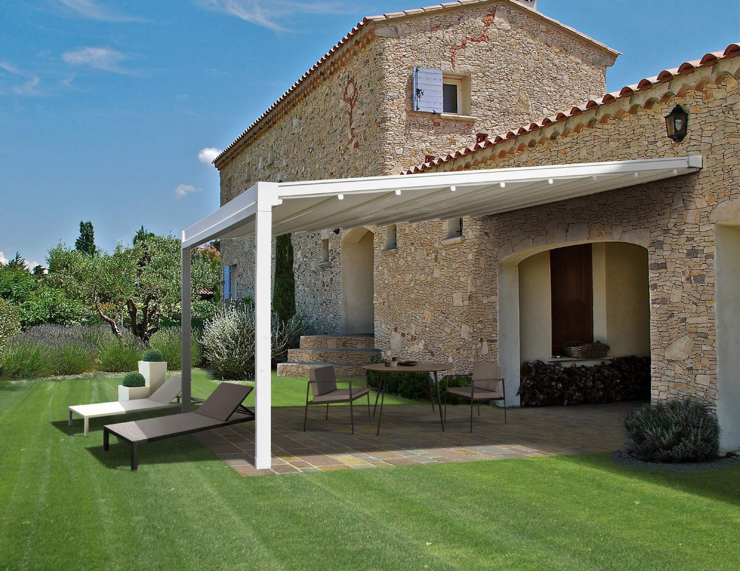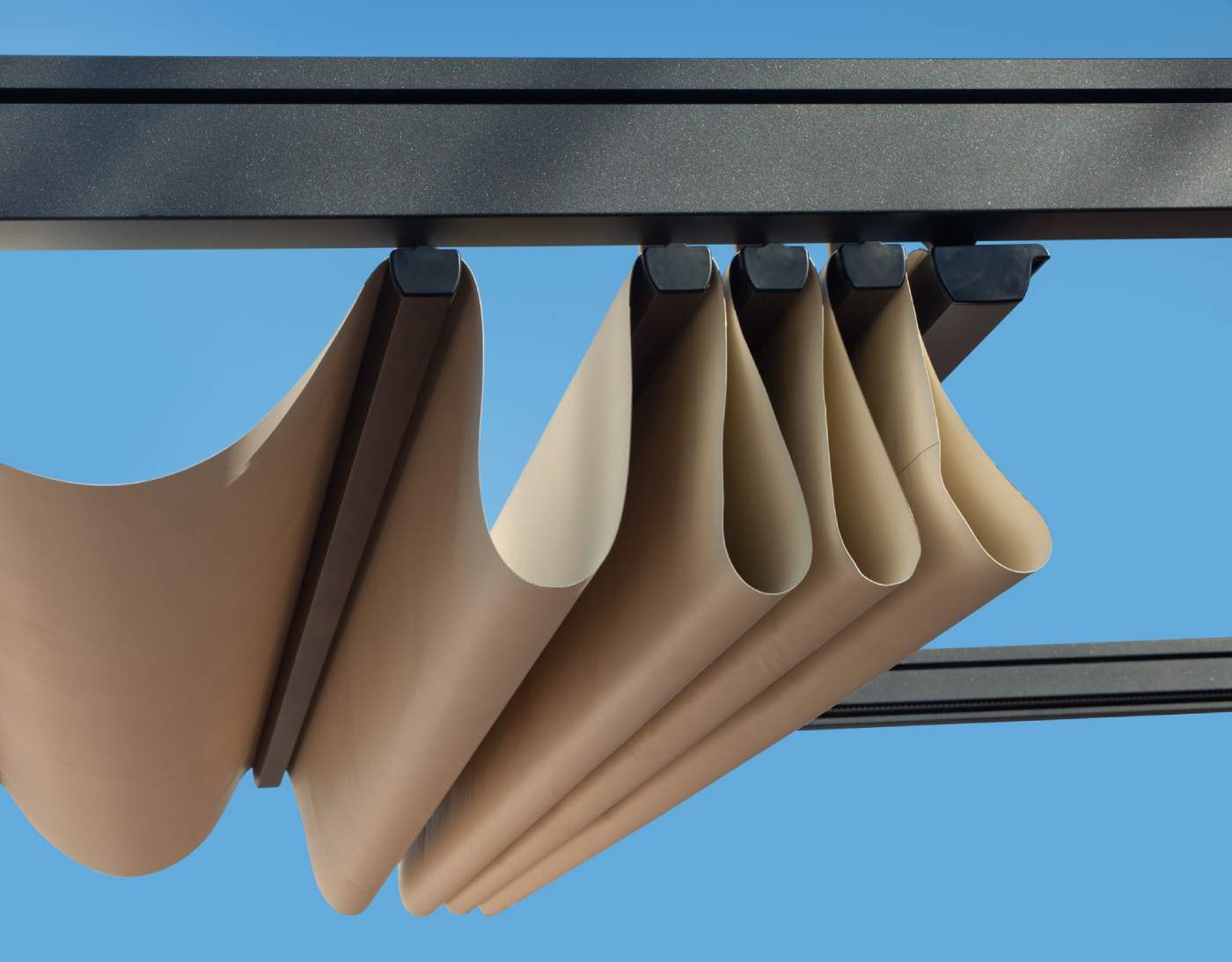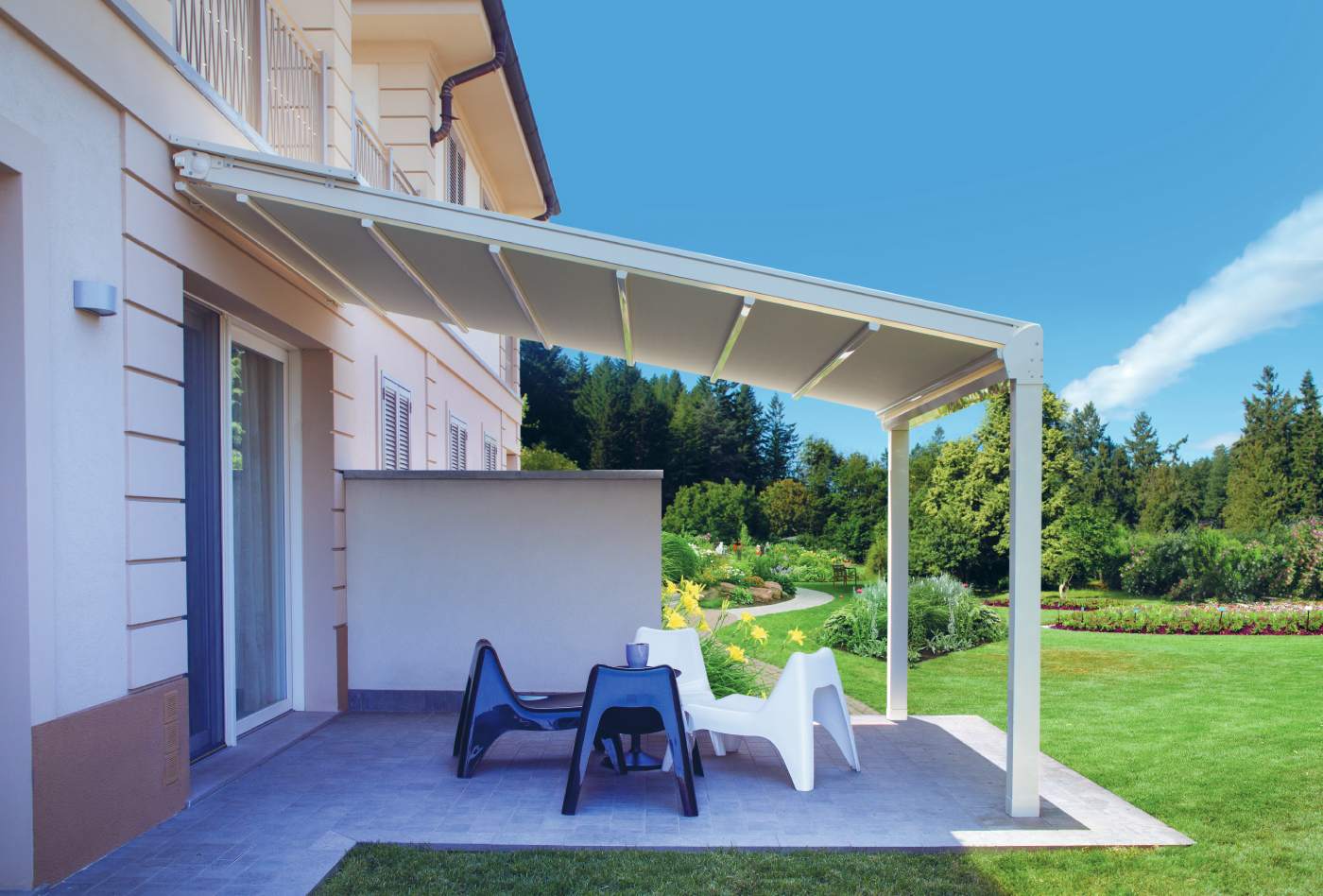 Una pergotenda in tessuto fornisce una sicura copertura dalla pioggia: è ottimale per proteggere zone di medie e grandi dimensioni dove sia possibile installare una struttura fissa, a parete o a terra